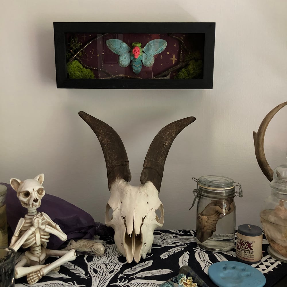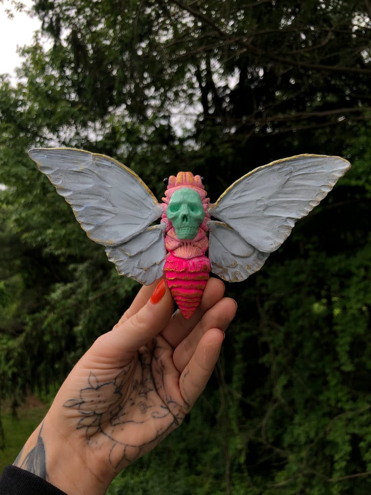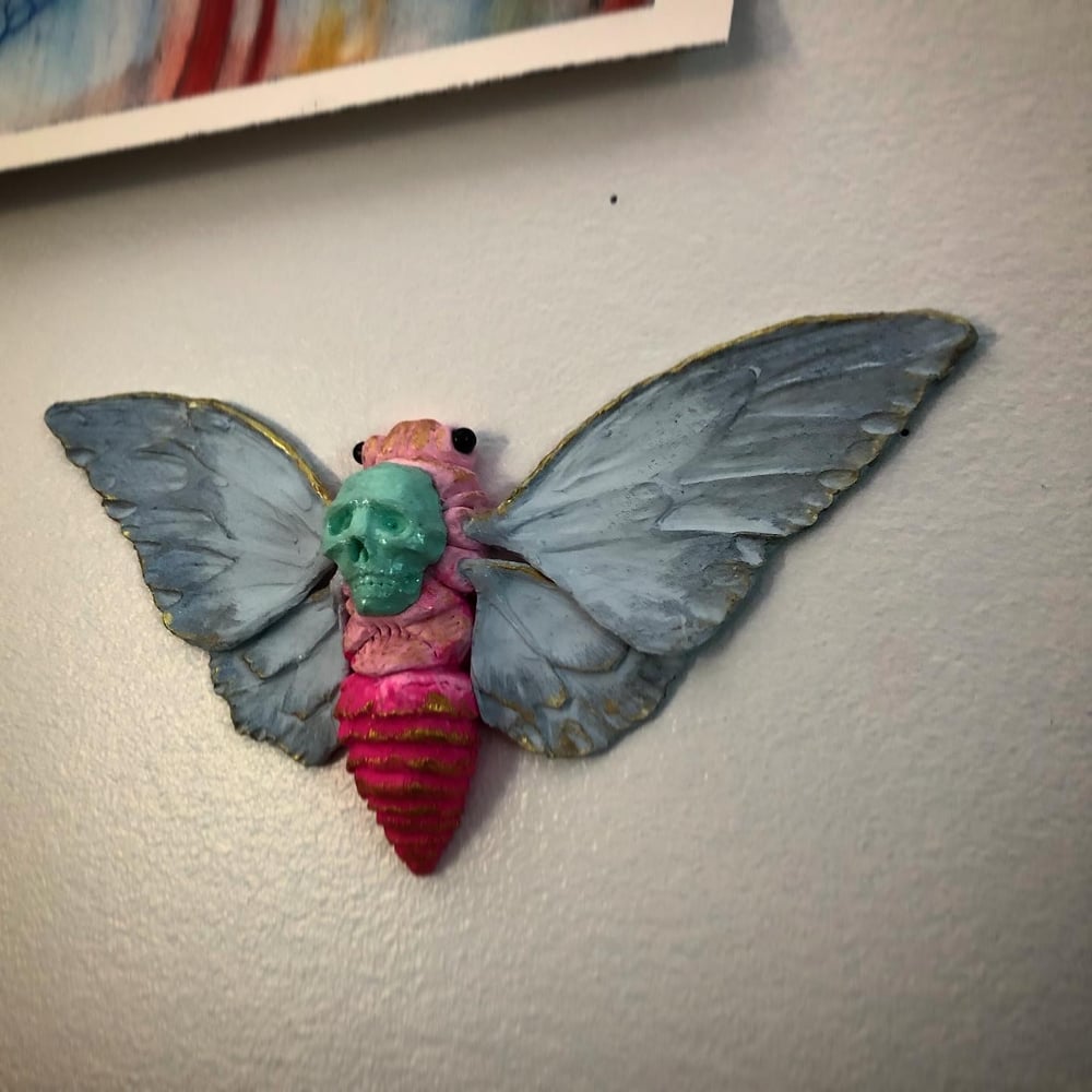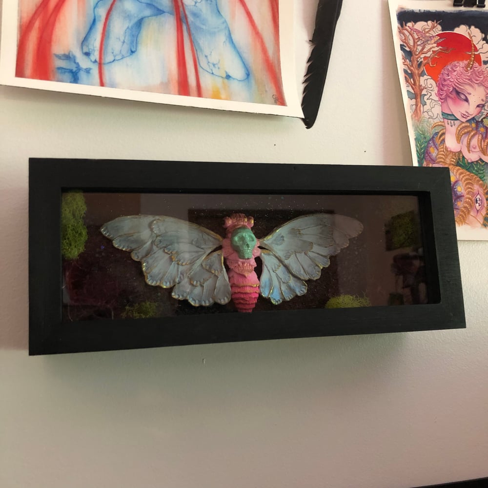 Hand made + hand painted, these Crytpid Cicadas will add a flare of queer cuteness to compliment any weirdo’s oddity collection. Made to order, each Death Cicada will have their own unique personality. Feel free to message me with color preferences but I am controlled by the art gods to make whatever comes through without question. See photos for a couple of color options that I’ve already done and would love to do again. The shadow box offers a displayable home for your cute cicada. Each box is hand chosen for the final size of your sculpt and adorned with small details that will keep you looking in. Box closes with a trustable magnet. Each Death Cicada, and box, is signed and dated for authenticity. S&H Included Est. Delivery time 3-4 weeks from order date.