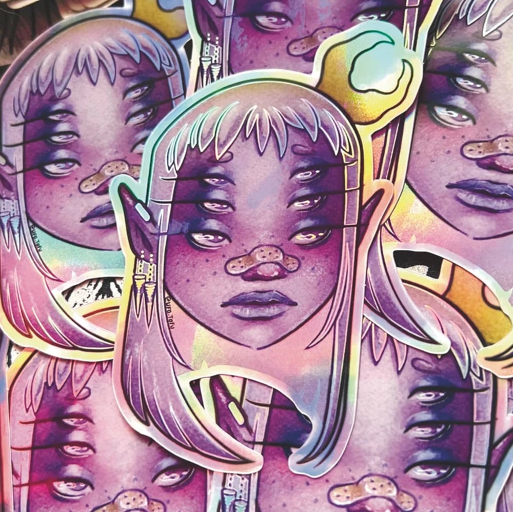 Crow is one of my oldest known parts. A protector, a mother; angry; they want the very best for me and have a destructive intolerance for mistreatment of me or my loved ones. I feel them when the cold rushes over me and my heart closes up. Safe from the pain of disappointment. I love this part so much. They have saved my life many times. Original Mixed media Arches paper 4.5x7 inches Prints Gicleé Coldpress paper 4.5x7 inches +1/4 additional framing border Stickers Holographic Glossy 2.9”X 4” Free S&H
