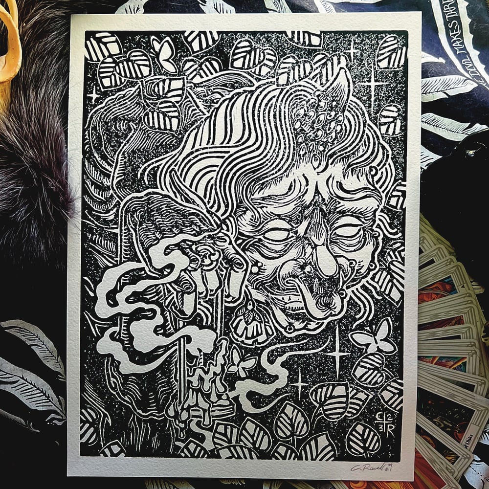 Woodblock Carve Speedball Print Arches Coldpress Paper 11”x 14” Free S&H (Printed with an additional border for framing) Was she hideous? Was she a healer? The witness couldn’t tell beyond the warnings they had been fed, but the growth seemed to flourish in around her, butterflies materialized and she held a peculiar smile that the young one didn’t feel any malice or withheld horrors behind. He watched her move into the shadow clearing between the eldest trees that guarded the city from the wild world, and he felt peace.